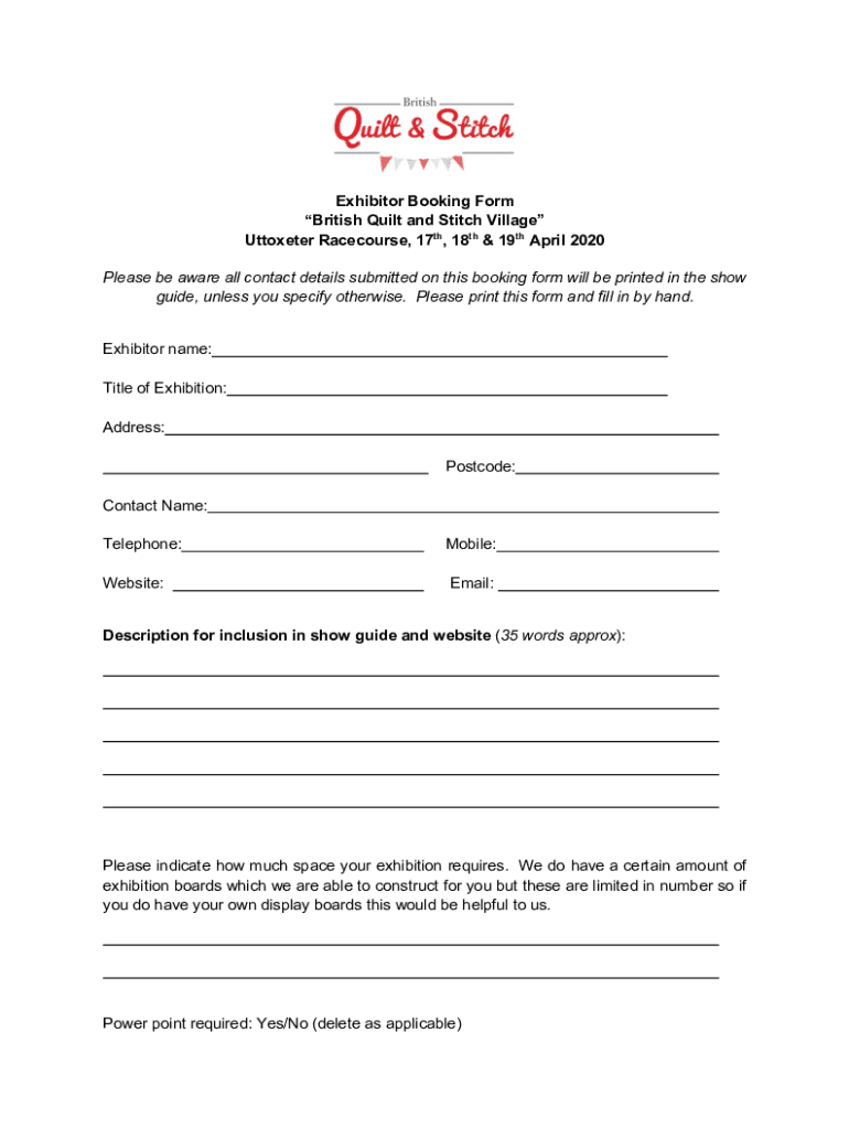 Exhibitor Booking Form British Quilt and Stitch Village Attometer Racecourse, 17th, 18th & 19th April 2020 Please be aware all contact details submitted on this booking form will be printed in the