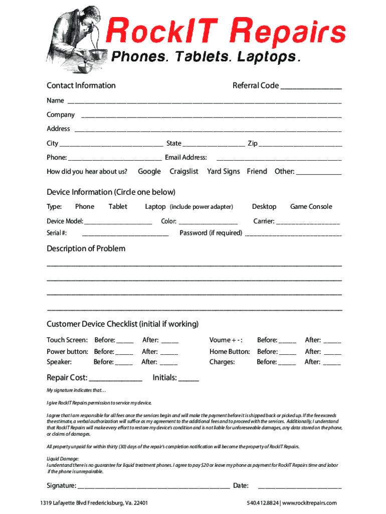 Contact InformationReferral Code Name Company Address City State Zip Phone: Email Address: How did you hear about us? Craigslist Google Yard Signs Friend Other: Device Information (Circle one below)