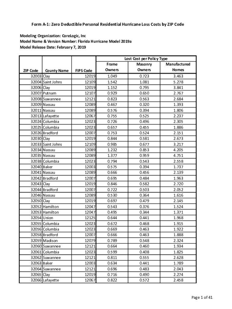 Form A1: Zero Deductible Personal Residential Hurricane Loss Costs by ZIP Code Modeling Organization: CoreLogic, Inc Model Name & Version Number: Florida Hurricane Model 2019a Model Release Date: