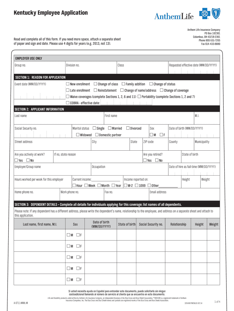The Kentucky Employee Application is an employment application form used by employees to apply for or change life and disability insurance coverage offered by their employer.