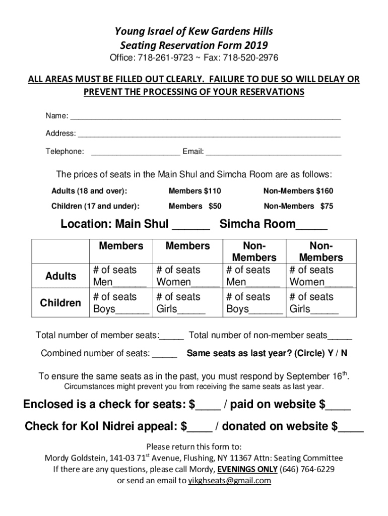 Young Israel of New Gardens Hills Seating Reservation Form 2019 Office: 7182619723 Fax: 7185202976ALL AREAS MUST BE FILLED OUT CLEARLY. FAILURE TO Do SO WILL DELAY OR PREVENT THE PROCESSING OF YOUR