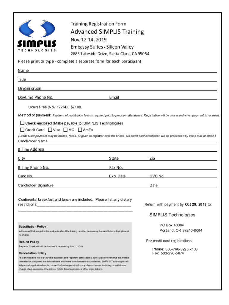 Training Registration FormAdvanced SIMPLY Training Nov. 1214, 2019 Embassy Suites Silicon Valley 2885 Lakeside Drive, Santa Clara, CA 95054 Please print or type complete a separate form for each participant