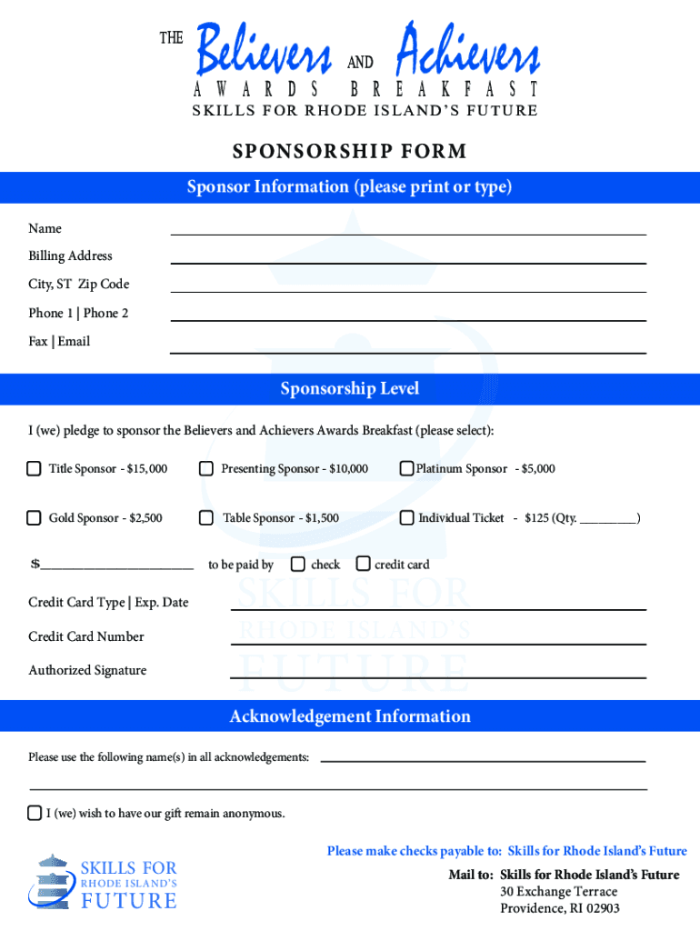 Believers AchieversTHEANDA W A R D SB R E A K F A ST SKILLS FOR RHODE ISLANDS FUTURESPONSORSHIP FORM Sponsor Information (please print or type) Name Billing Address City, ST Zip Code Phone 1 Phone