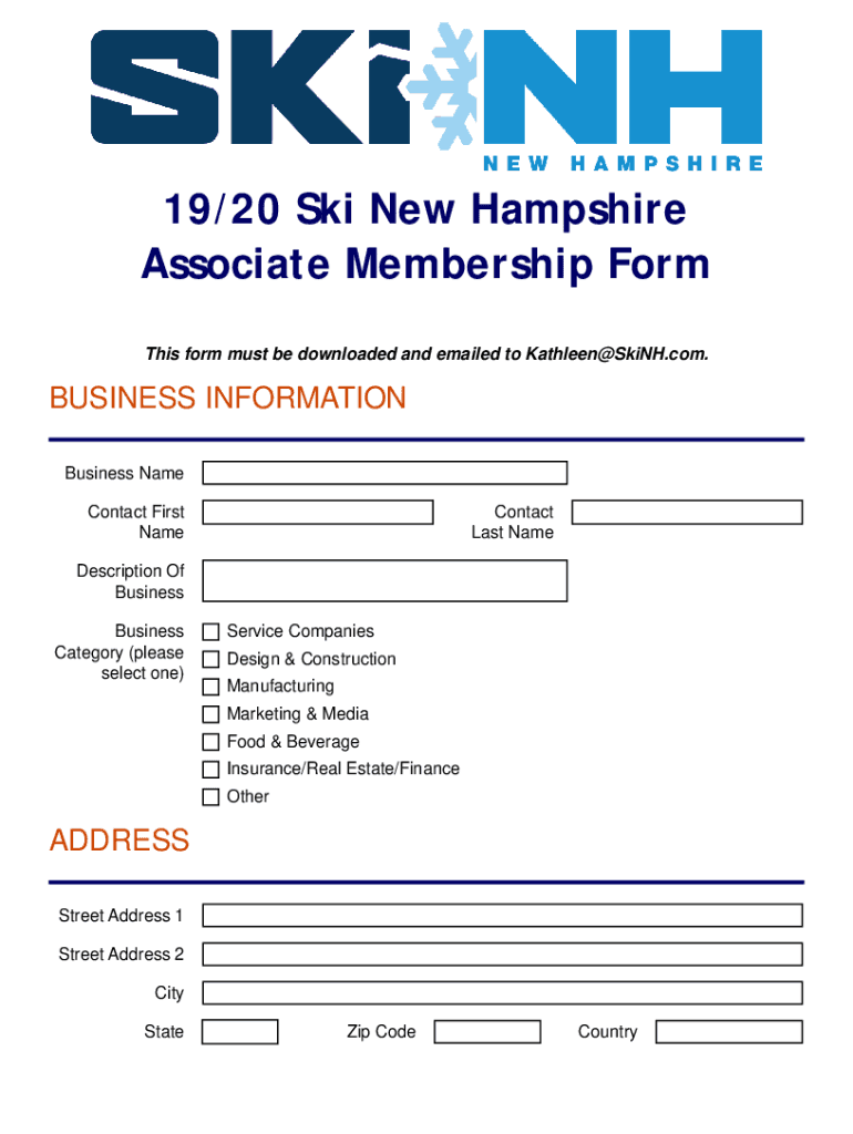 19/20 Ski New Hampshire Associate Membership Form This form must be downloaded and emailed to Kathleen SkiNH.com.BUSINESS INFORMATION Business Name Contact First Recontact Last NameDescription Of