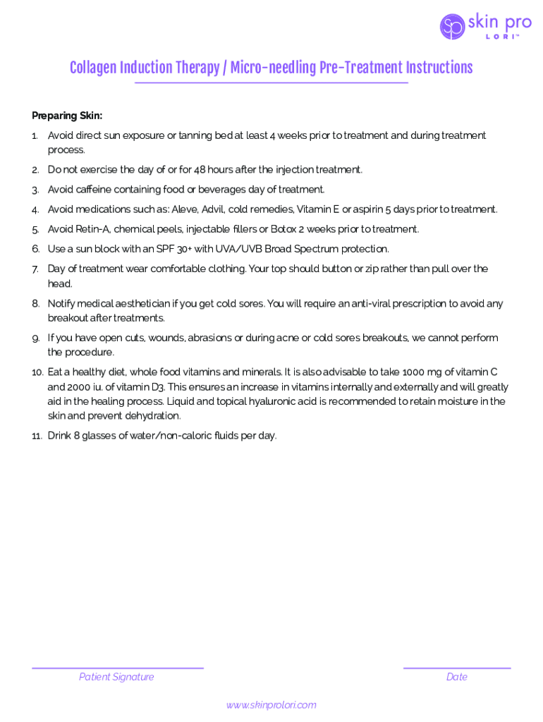 Collagen Induction Therapy / Microneedling PreTreatment Instructions Preparing Skin: 1. Avoid direct sun exposure or tanning bed at least 4 weeks prior to treatment and during treatment process. 2.