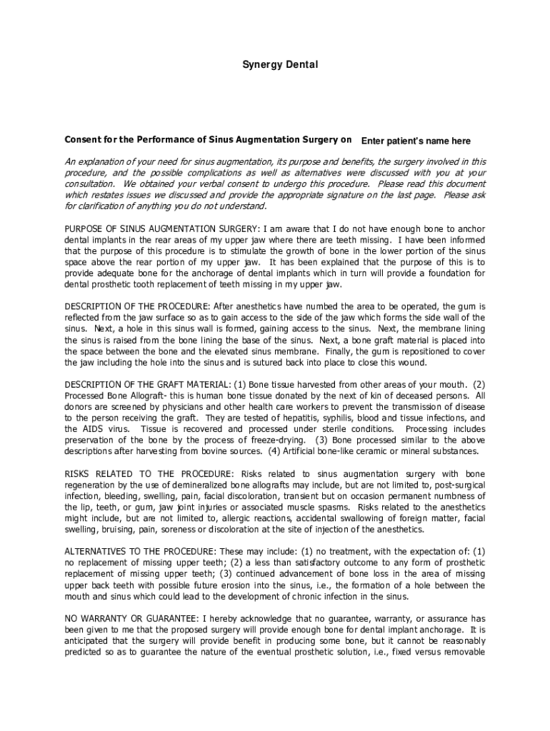 Synergy DentalConsent for the Performance of Sinus Augmentation Surgery center patient\'s name Herman explanation of your need for sinus augmentation, its purpose and benefits, the surgery involved