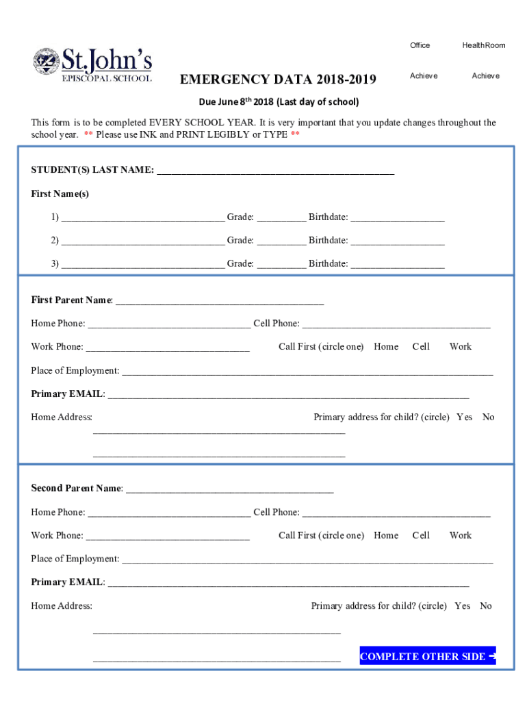 OfficeEMERGENCY DATA 20182019HealthRoomAchieveAchieveDueJune8th2018(Lastdayofschool) This form is to be completed EVERY SCHOOL YEAR. It is very important that you update changes throughout the school
