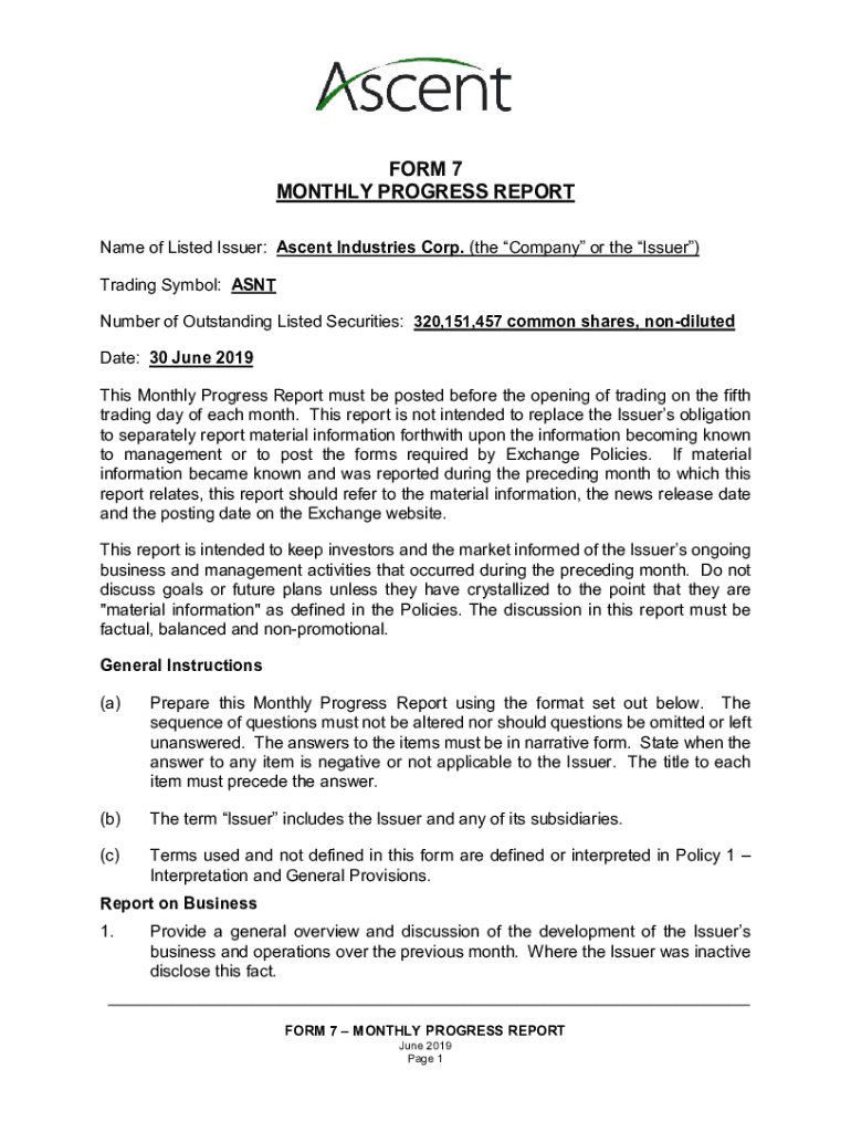 Name of Listed Issuer: Ascent Industries Corp. (the Company or the Issuer)