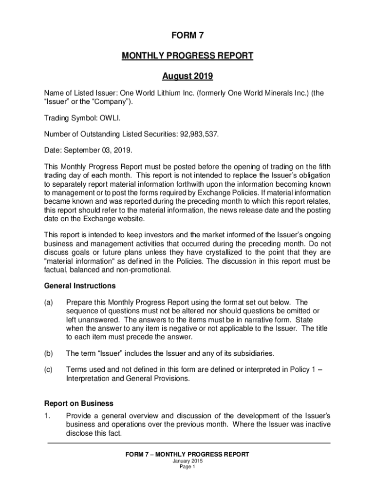 Name of Listed Issuer: One World Lithium Inc. (formerly One World Minerals Inc.) (the