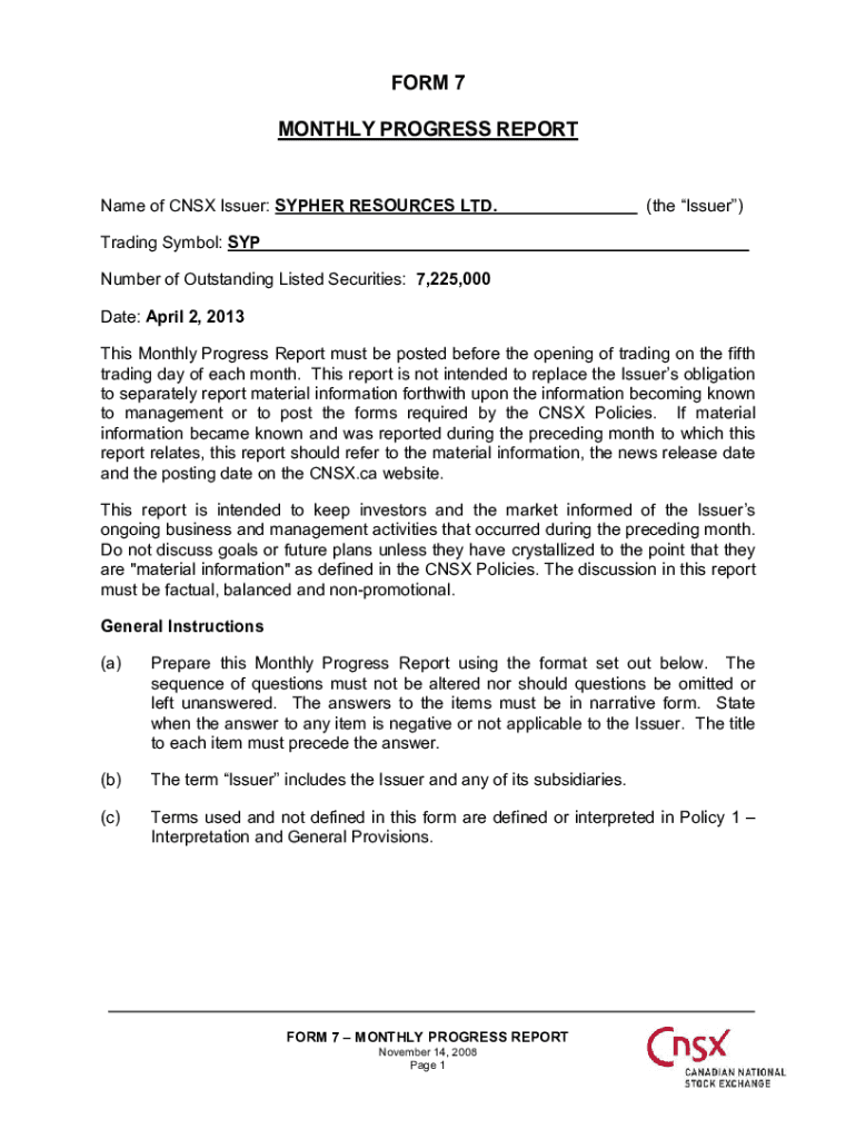 MONTHLY PROGRESS Reportage of CNS Issuer: CYPHER RESOURCES LTD.(the Issuer)Trading Symbol: SVP