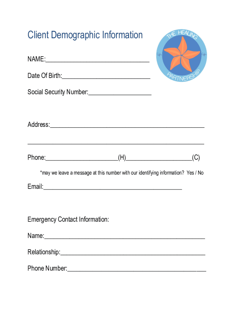 Client Demographic Information NAME: Date Of Birth: Social Security Number: Address: Phone: (H) (C) *may we leave a message at this number with our identifying information? Yes / Noémie: Emergency