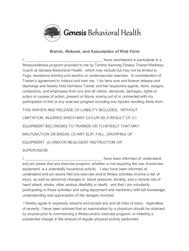 Waiver, Release, and Assumption of Risk Form I, have volunteered to participate in a fitness/wellness program provided to me by Tammy Banning Fitness Trainer/Wellness Coach at Genesis Behavioral Health,