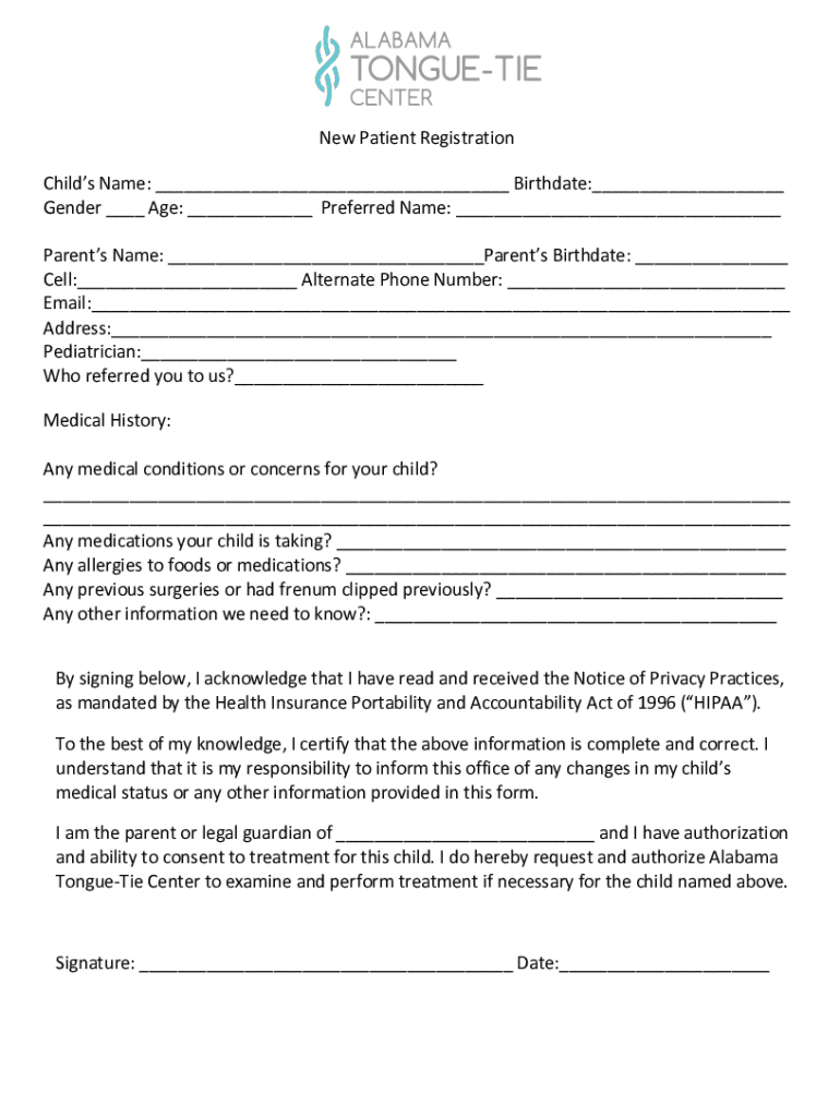 Get the free New Patient Registration - Alabama Tongue-Tie Center