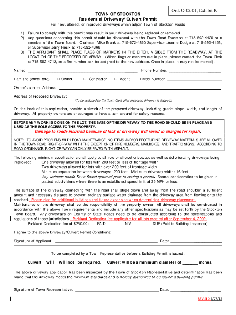 Residential Driveway/Culvert Permit new, altered, or improved driveways which adjoin Town of Stockton Roads