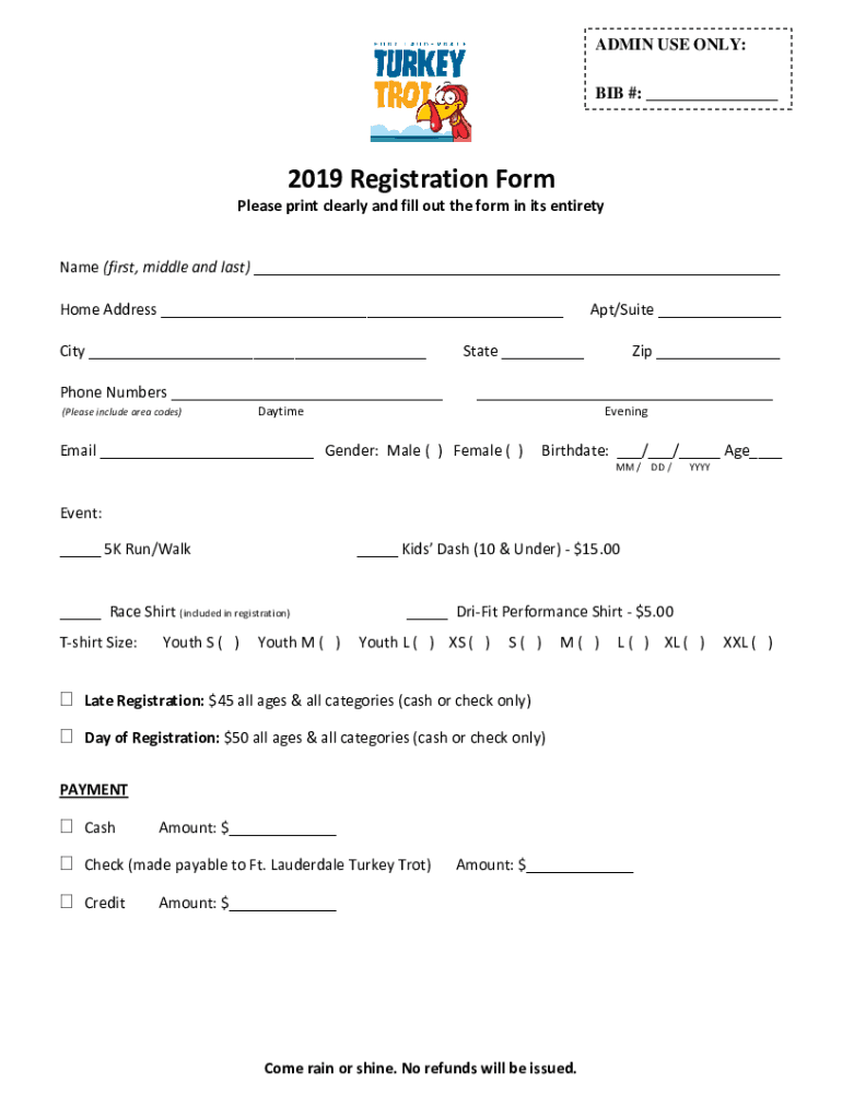 ADMIN USE ONLY: BIB #: 2019 Registration Form Please print clearly and fill out the form in its entiretyName (first, middle and last) Home Address City Phone Numbers (Please include area codes)Apt/Suite