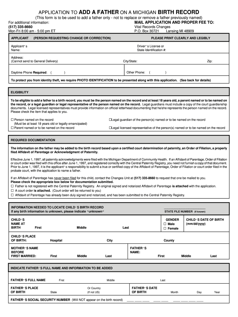 To successfully complete the Michigan Birth Record Father Addition Application, applicants must meet specific eligibility criteria and provide required information. Applicants need to furnish details including: