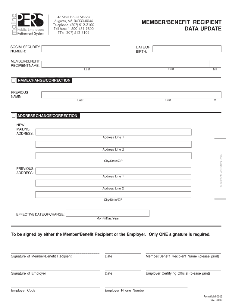 46 State House Station Augusta, ME 04333-0046 Telephone: (207) 512-3100 Toll-free: 1-800-451-9800 TTY: (207) 512-3102 MEMBER/BENEFIT RECIPIENT DATA UPDATE SOCIAL SECURITY NUMBER: DATE OF BIRTH: MEMBER/BENEFIT
