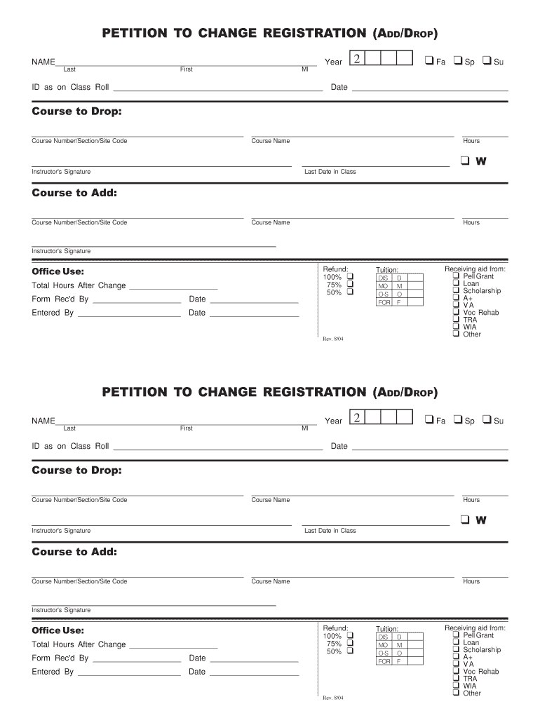 PETITION TO CHANGE REGISTRATION (ADD/DROP) NAME Last First Year q Fa q Sp q SU 2 MI ID as on Class Roll Date Course to Drop: Course Number/Section/Site Code Course Name Hours Instructor's Signature