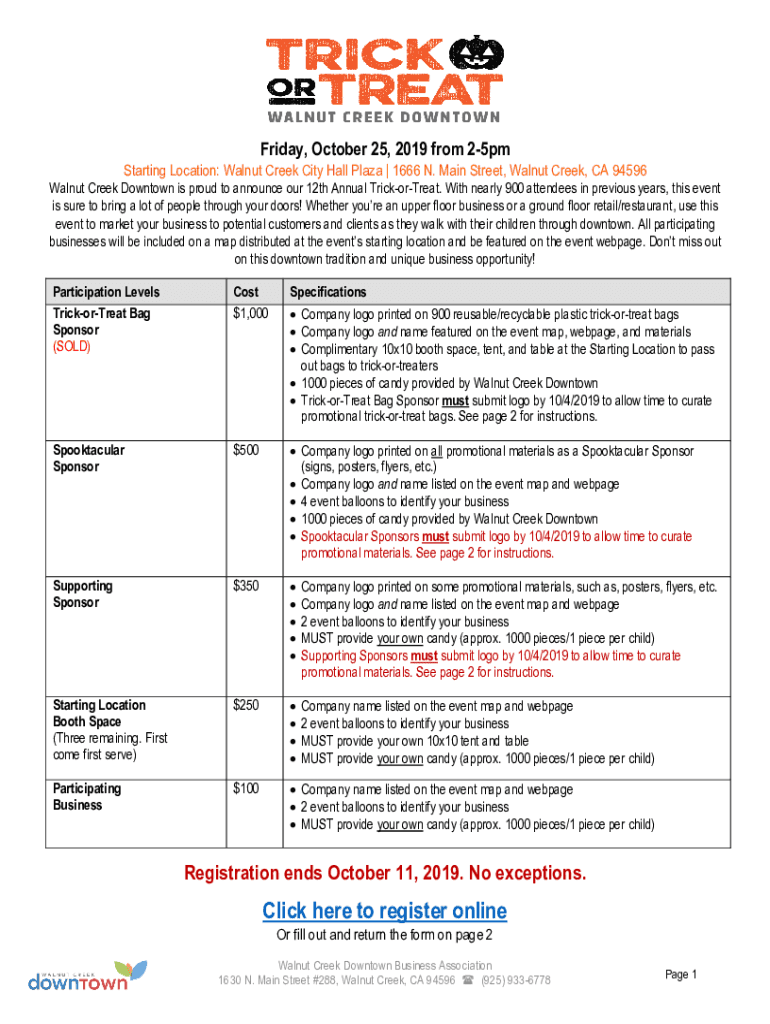 Friday, October 25, 2019, from 25pm Starting Location: Walnut Creek City Hall Plaza 1666 N. Main Street, Walnut Creek, CA 94596 Walnut Creek Downtown is proud to announce our 12th Annual TrickorTreat.