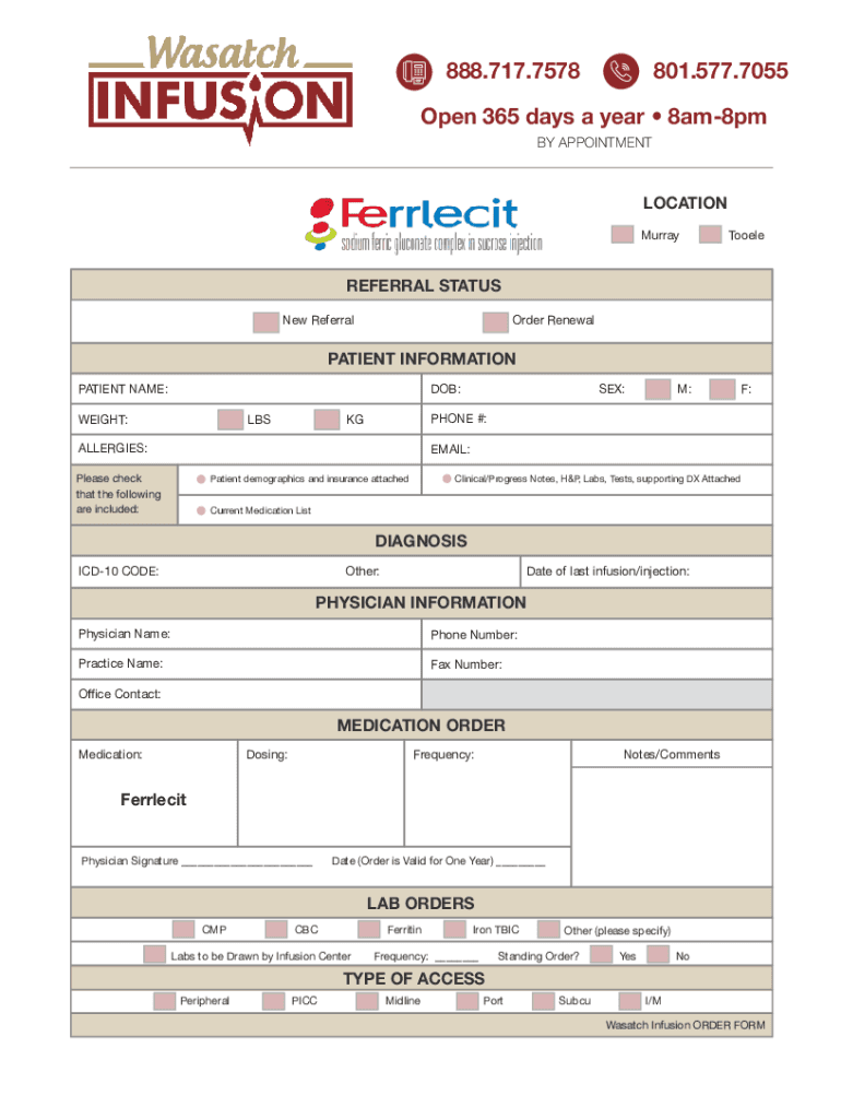 801.577.7055888.717.7578Open 365 days a year 8am8pm BY APPOINTMENTLOCATION MurrayTooeleREFERRAL STATUS New ReferralOrder RenewalPATIENT INFORMATION PATIENT NAME:DOB:WEIGHT’M:F:PHONE #:GLASSES:ALLERGIES:EMAIL:Please