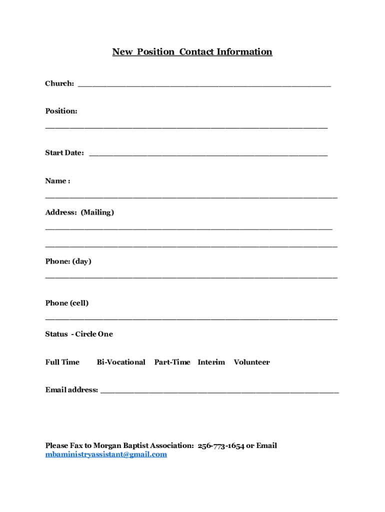 New Position Contact Information Church: Position: Start Date: Name : Address: (Mailing) Phone: (day) Phone (cell) Status Circle Overfull TimeBiVocationalPartTimeInterimVolunteerEmail address: Please