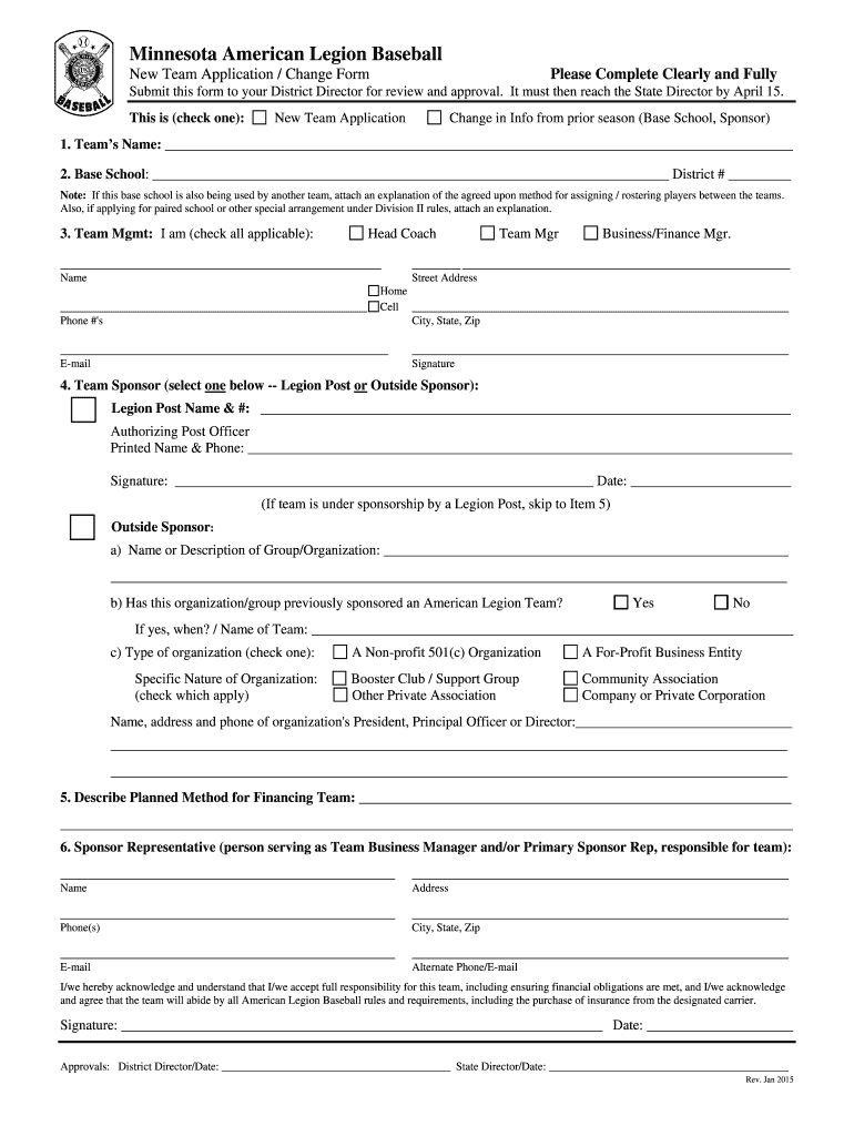 Minnesota American Legion Baseball New Team Application / Change Form Please Complete Clearly and Fully Submit this form to your District Director for review and approval. It must then reach the State