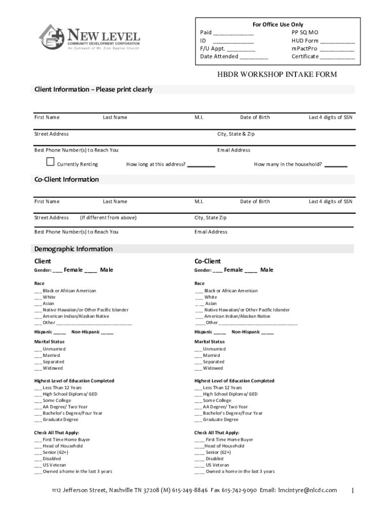 For Office Use Only Paid PP SQ MO ID HUD Form F/U Apt. Macro Date Attended Certificate HDR WORKSHOP INTAKE FORM Client Information Please print clearlyFirst Nameless Name. I. Date of Bradstreet Addressing,