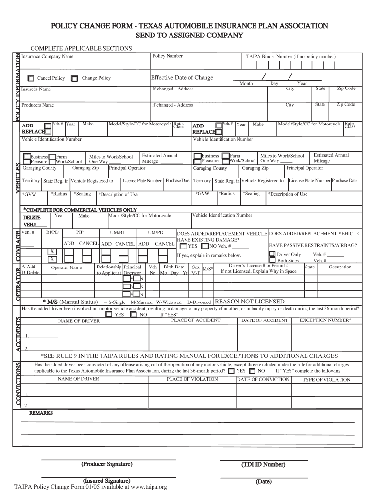 The Texas Automobile Insurance Policy Change Form is a business document used by insured individuals and producers to update insurance policy details.
