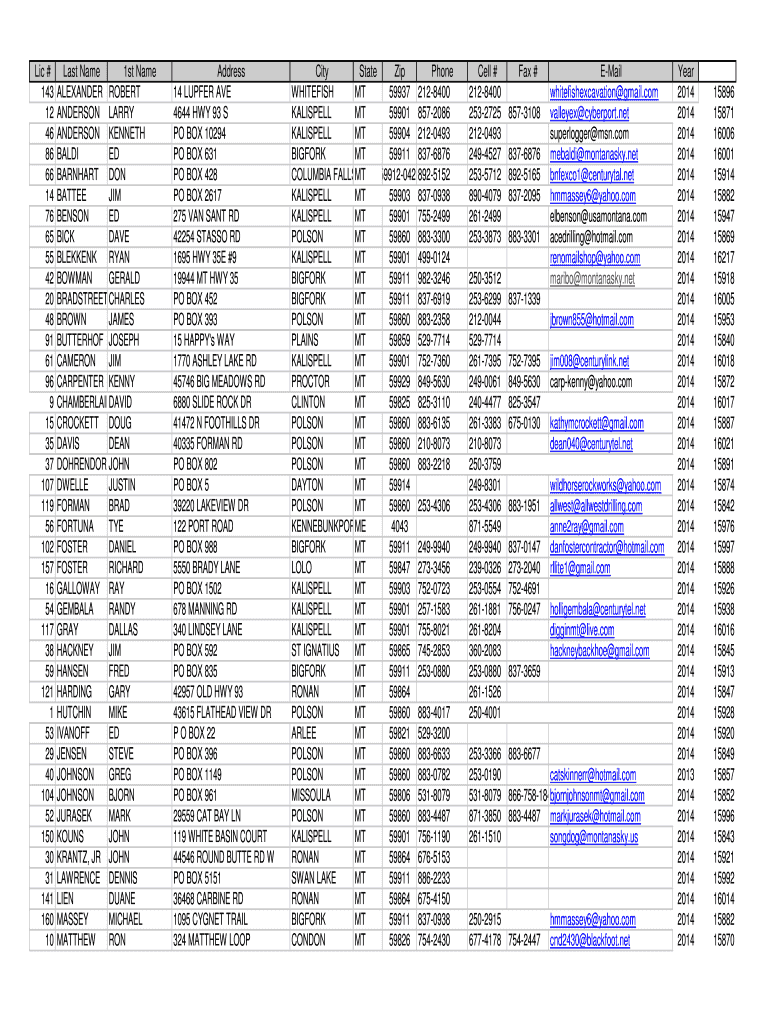 Get the free Lic # Last Name 1st Name Address City State Zip Phone Cell # Fax ...
