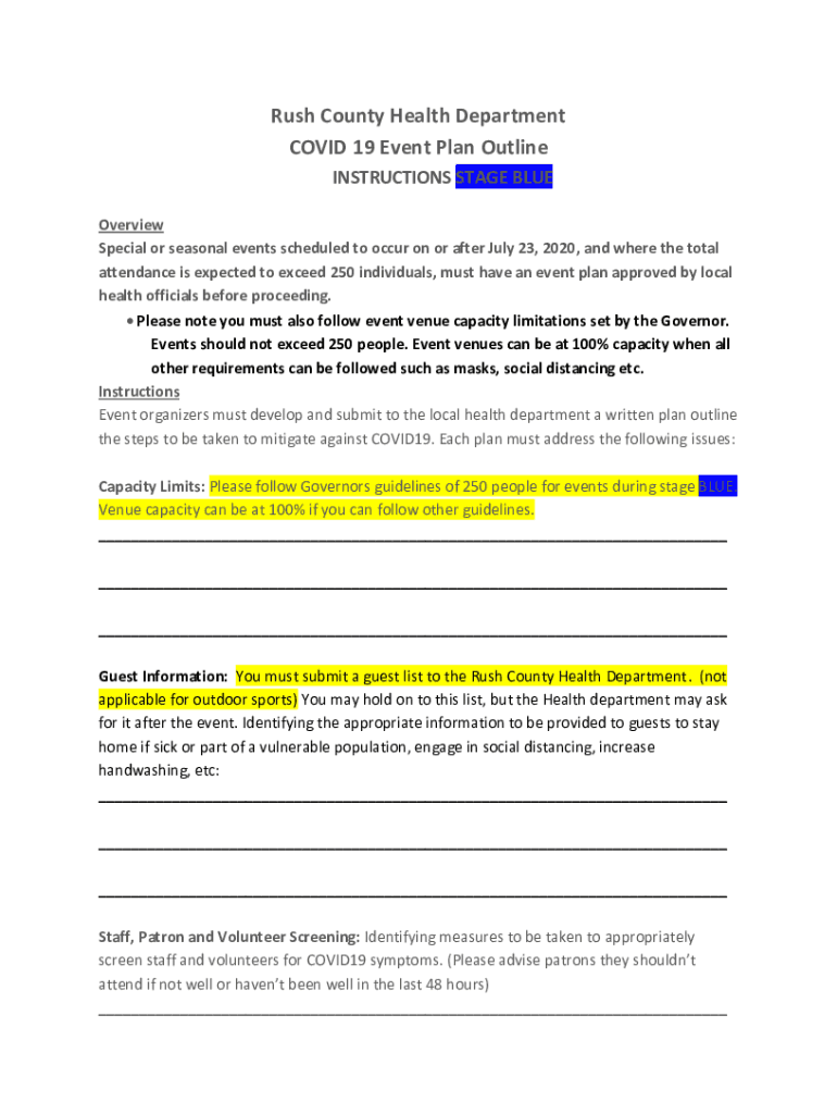 Rush County Health Department COVID-19 Event Plan Outline INSTRUCTIONS STAGE BLUE Overview Special or seasonal events scheduled to occur on or after July 23, 2020, and where the total attendance is