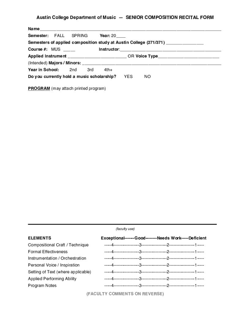 Students who are completing their senior recital as part of their degree program in music or performance are required to file the senior comp recital form May 2013.