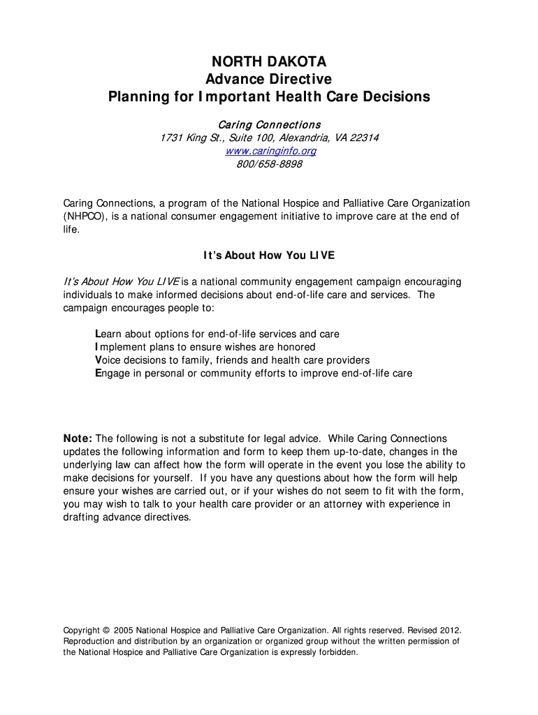 NORTH DAKOTA Advance Directive Planning for Important Health Care Decisions Caring Connections 1731 King St., Suite 100, Alexandria, VA 22314 www.caringinfo.org 800/6588898 Caring Connections, a program