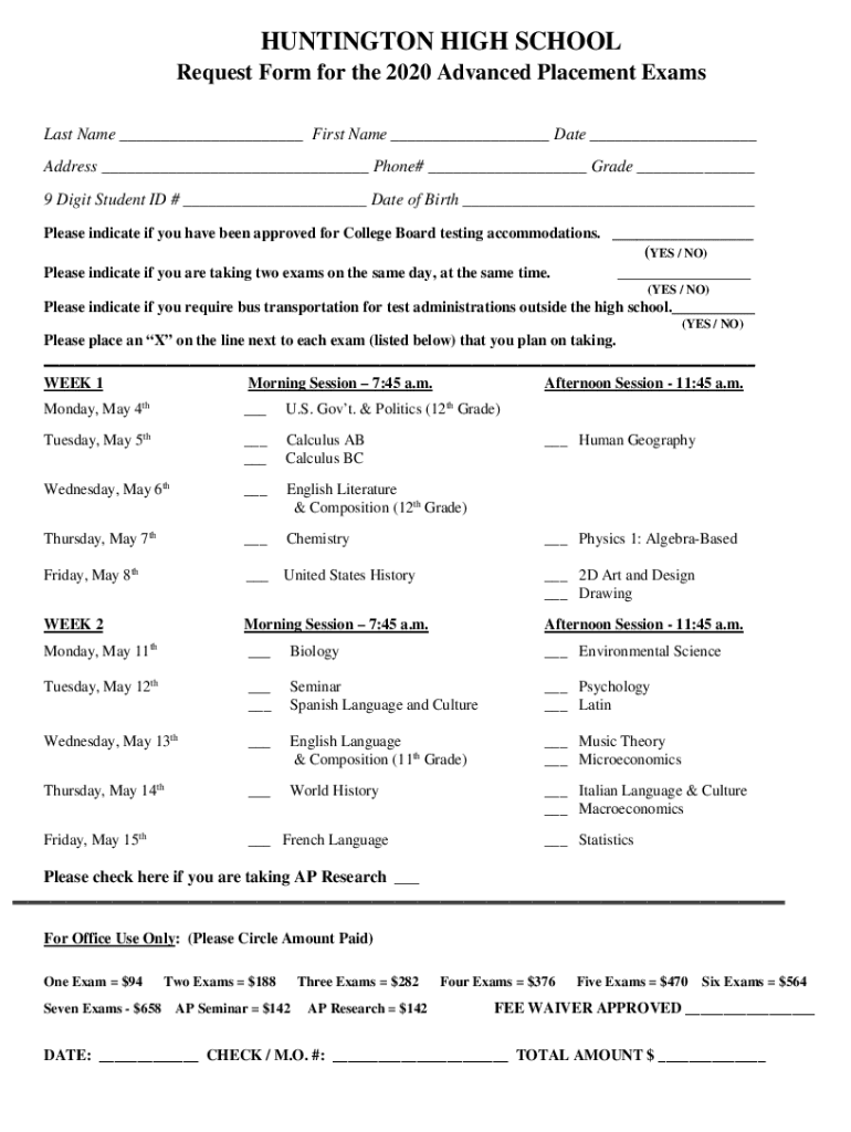 HUNTINGTON HIGH SCHOOL Request Form for the 2020 Advanced Placement Exams Last Name First Name Date Address Phone# Grade 9 Digit Student ID # Date of Birth Please indicate if you have been approved