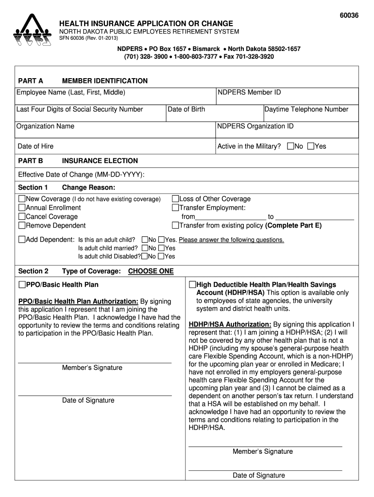 The North Dakota Health Insurance Application, also known as SFN 60036, is essential for individuals seeking health insurance coverage through the North Dakota Public Employees Retirement System (NDPERS). This form is critical for obtaining or modifying health coverage, ensuring members and their dependents are protected.