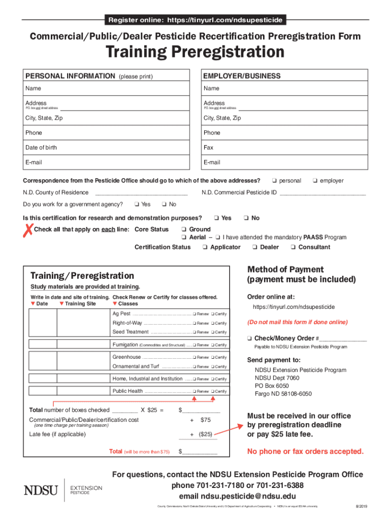 Register online: https://tinyurl.com/ndsupesticideCommercial/Public/Dealer Pesticide Recertification Preregistration Constraining PreregistrationPERSONAL INFORMATION (please print) EMPLOYER/BUSINESS