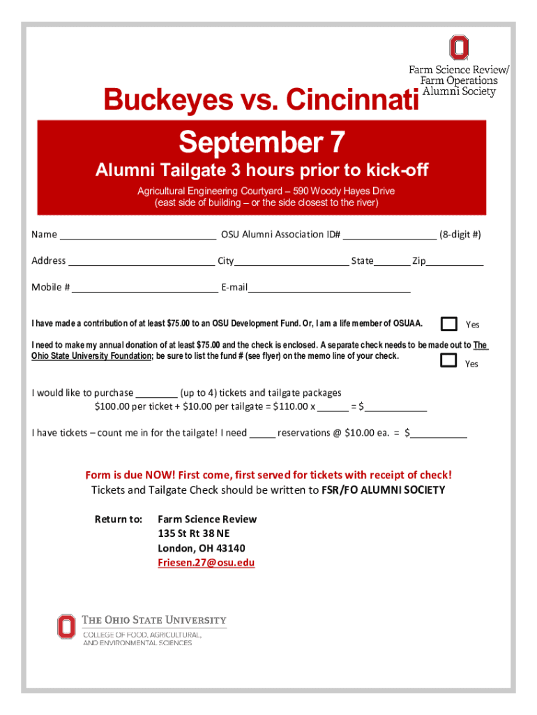 Buckeyes vs. Cincinnati September 7Alumni Tailgate 3 hours prior to kickoff Agricultural Engineering Courtyard 590 Woody Hayes Drive (east side of building or the side closest to the river)Name OSU