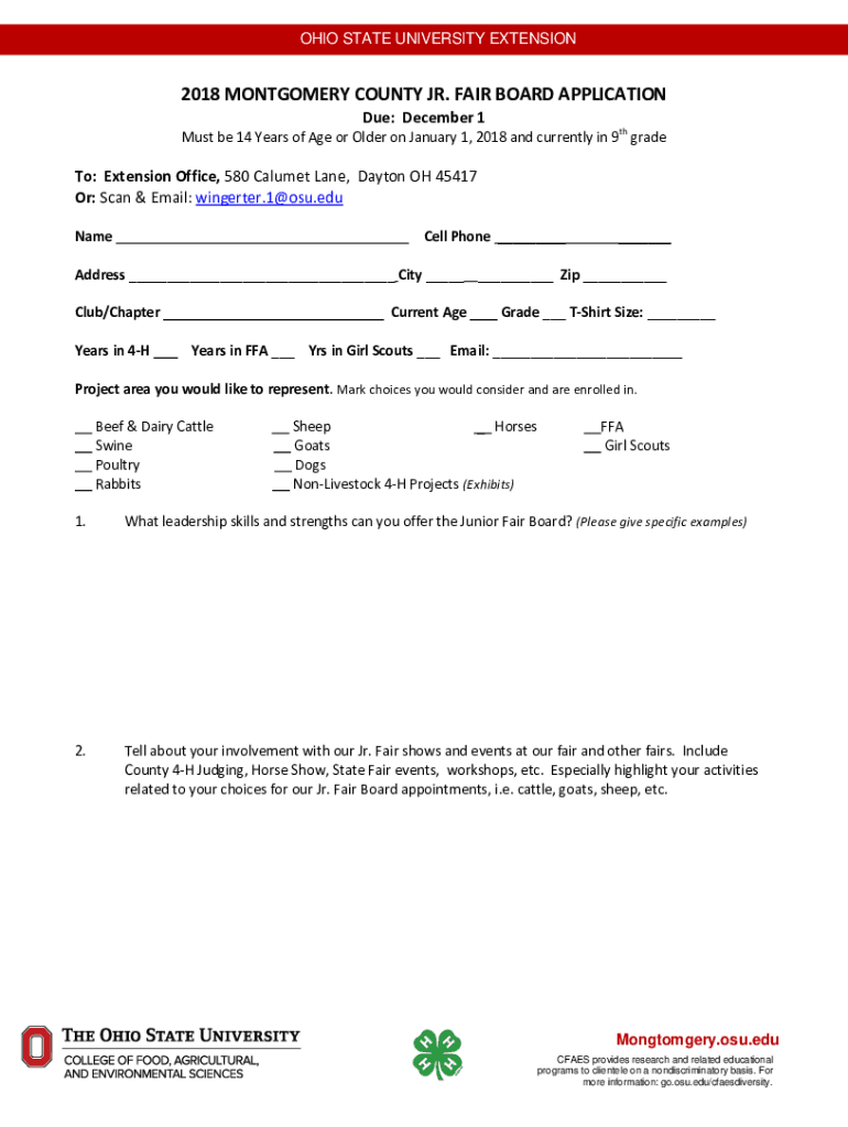 OHIO STATE UNIVERSITY EXTENSION2018MONTGOMERYCOUNTYJR.FAIRBOARDAPPLICATION Due:December1 Mustbe14YearsofAgeorOlderonJanuary1,2018andcurrentlyin9thgrade To:ExtensionOffice,580CalumetLane,DaytonOH45417