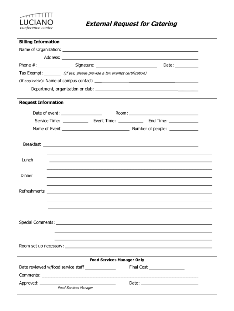 External Request for Catering Billing Information Name of Organization: Address: Phone #: Tax Exempt:Signature:Date:(If yes, please provide a tax-exempt certification)(If applicable): Name of campus
