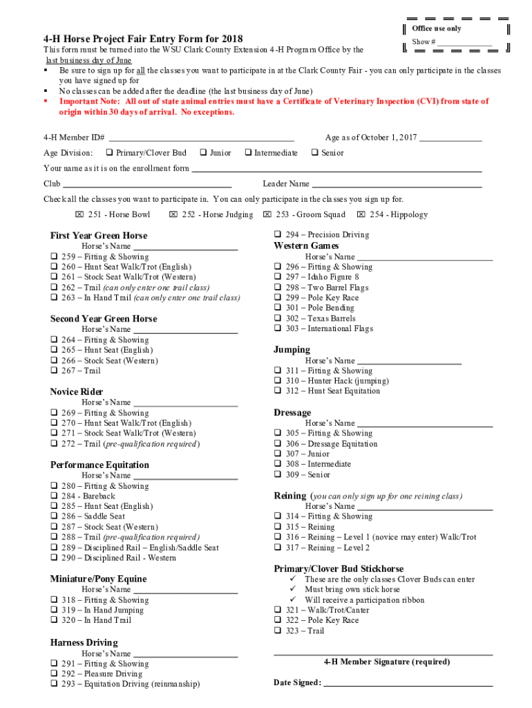 Office use only4H Horse Project Fair Entry Form for 2018Show # This form must be turned into the WSU Clark County Extension 4H Program Office by the last business day of June Be sure to sign up for
