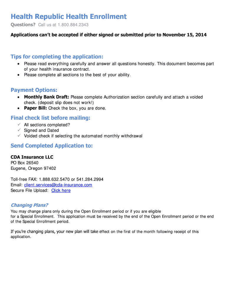 For questions regarding the Oregon Individual & Family Health Enrollment Application, you can contact Health Republic's customer service directly or refer to their official website for additional resources.