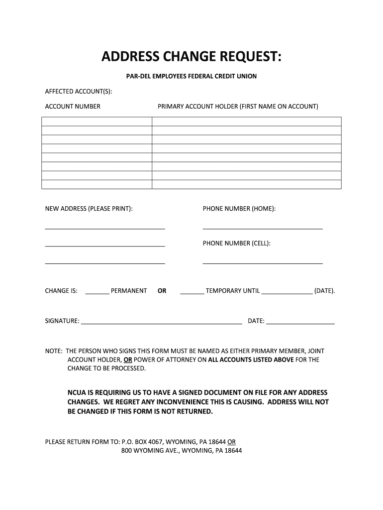 The Address Change Request Form is intended for account holders of the PAR-DEL Employees Federal Credit Union who need to update their address information.