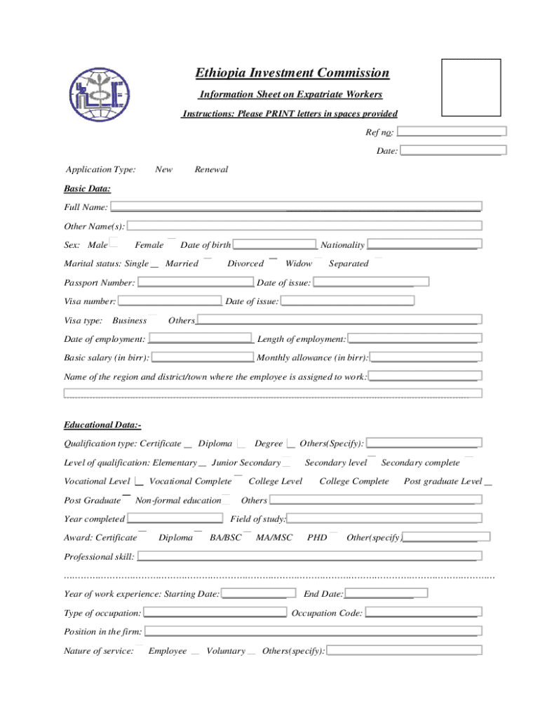 Ethiopia Investment Commission Information Sheet on Expatriate Workers Instructions: Please PRINT letters in spaces provided Ref no: Date: Application Type:NewRenewalBasic Data: Full Name: Other Name(s):