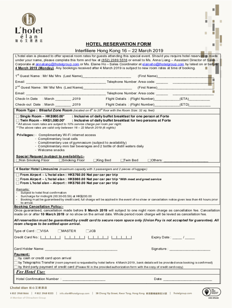 HOTEL RESERVATION FORM Interfere Hong Kong 16 22 March 2019 Hotel élan is pleased to offer special room rates for guests attending this special event. Should you require hotel reservation made under