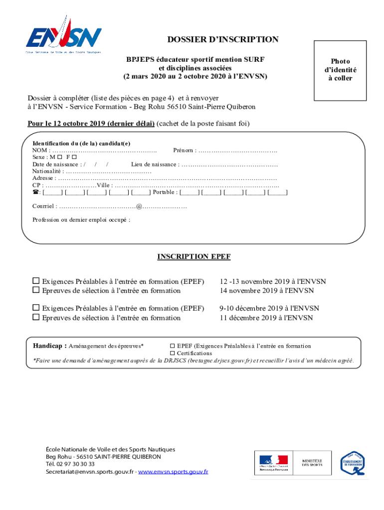 DOSSIER INSCRIPTION BPJEPS Decatur sport if mention SURF ET disciplines associates (2 Mars 2020 au 2 October 2020 lens)Photo identity collerDossier computer (list DES pics en page 4) ET enjoyed lens