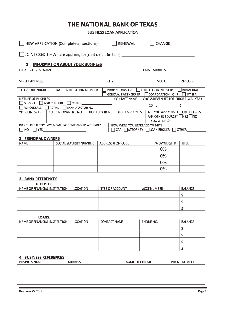 THE NATIONAL BANK OF TEXAS BUSINESS LOAN APPLICATION NEW APPLICATION (Complete all sections) RENEWAL CHANGE JOINT CREDIT We are applying for joint credit (initials) 1. INFORMATION ABOUT YOUR BUSINESS