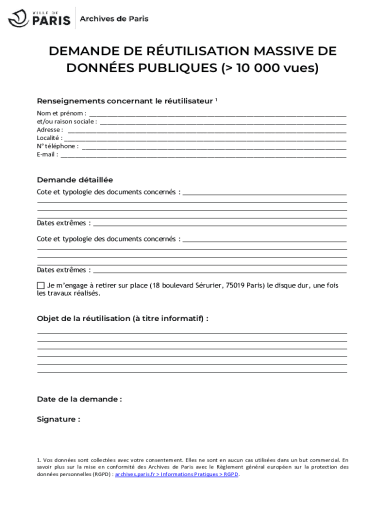 DEMAND DE UTILIZATION MASSIVE DE DONNÉS PUBLISHES (10 000 cues) Restatements concern ant LE rutilisateur 1 No met prom : ET/of raisin social : Address : Locality : N phone : Email : Demand Braille