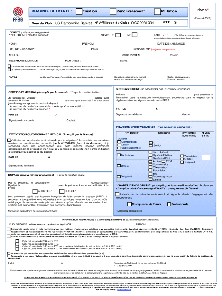 DEMAND DE License : Creation RenouvellementM:SEE*: F: (Format JPEG)NCD : 31Nom Du Club : US Eatonville Basket N Affiliation Du Club : OCC0031034 IDENTITY (*Mentions obligations) N DE License*(is DJ