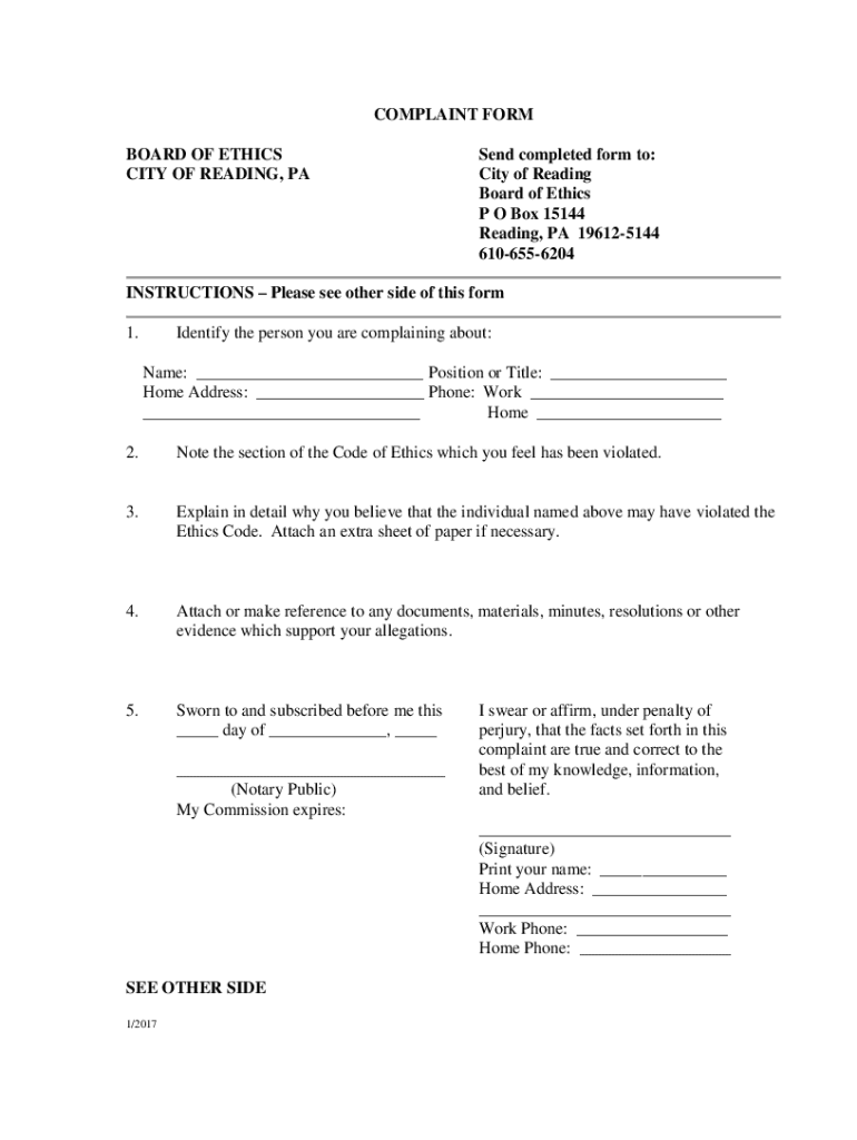 COMPLAINT FORM BOARD OF ETHICS CITY OF READING, PAS end completed form to: City of Reading Board of Ethics P O Box 15144 Reading, PA 196125144 6106556204INSTRUCTIONS Please see other side of this