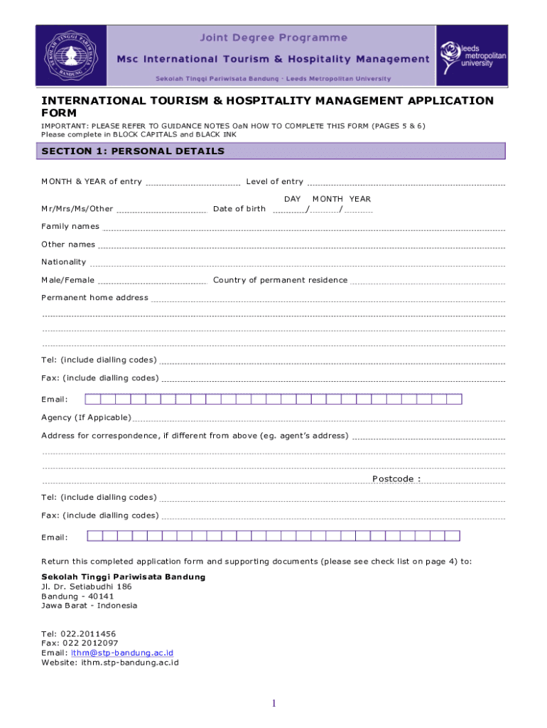 INTERNATIONAL TOURISM & HOSPITALITY MANAGEMENT APPLICATION FORM IMPORTANT: PLEASE REFER TO GUIDANCE NOTES OAN HOW TO COMPLETE THIS FORM (PAGES 5 & 6) Please complete in BLOCK CAPITALS and BLACK INFECTION