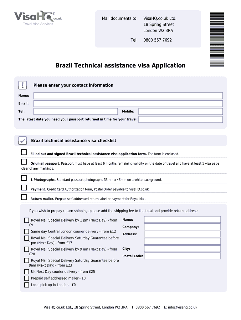 Mail documents to: Tel: Visa HQ.co.UK Ltd. 18 Spring Street London W2 3RA 0800 567 7692 Brazil Technical assistance visa Application Please enter your contact information Name: Email: Tel: Mobile: